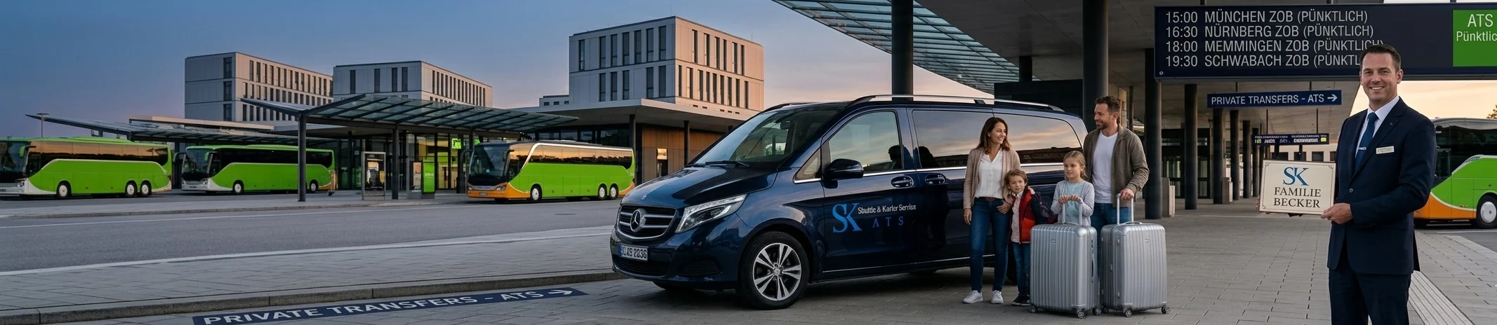 Privattransfer Fernbusbahnhof ab Augsburg und Umgebung: ATS bringt Sie direkt zu wichtigen Fernbusbahnhöfen und Zielorten in Bayern. Möglich sind private Fahrten nach München, Nürnberg, Memmingen und Schwabach – für 1–2 Personen, Familien oder Gruppen bis 8 Personen.